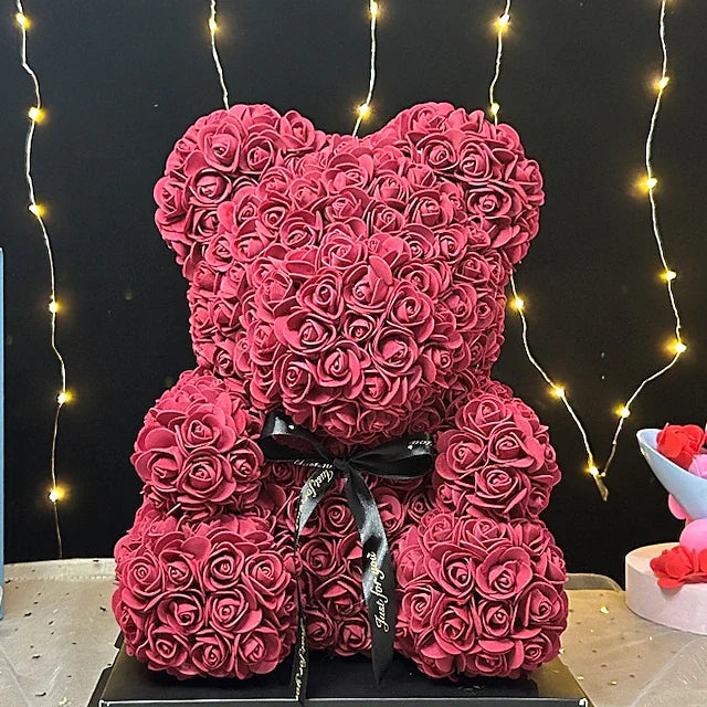 Give the lady you love a gift made of roses that are made to last! This gorgeous decorative teddy bear is crafted from soft synthetic roses in a romantic red color.